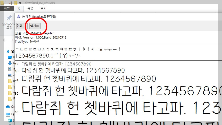 폰트 파일을 더블클릭하면, 설치 화면이 나옵니다. '설치' 버튼을 클릭해 주시면 완료됩니다.
