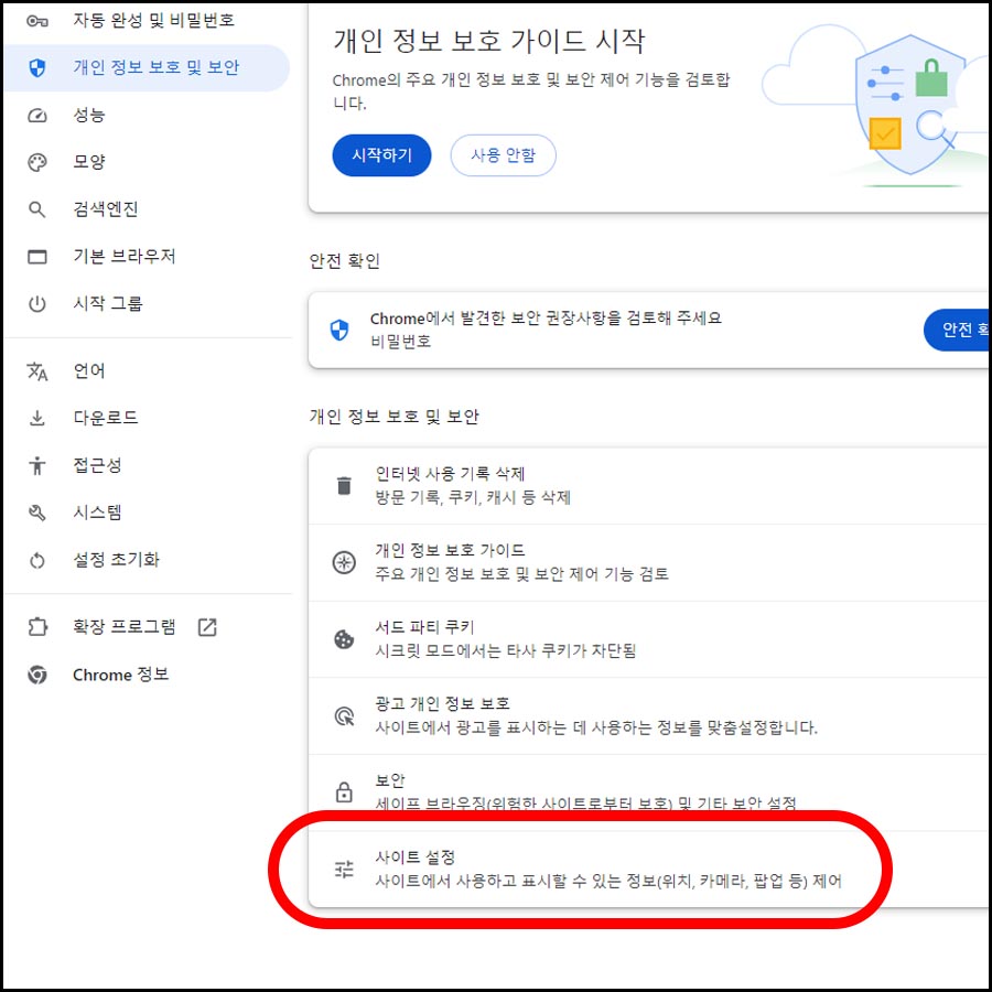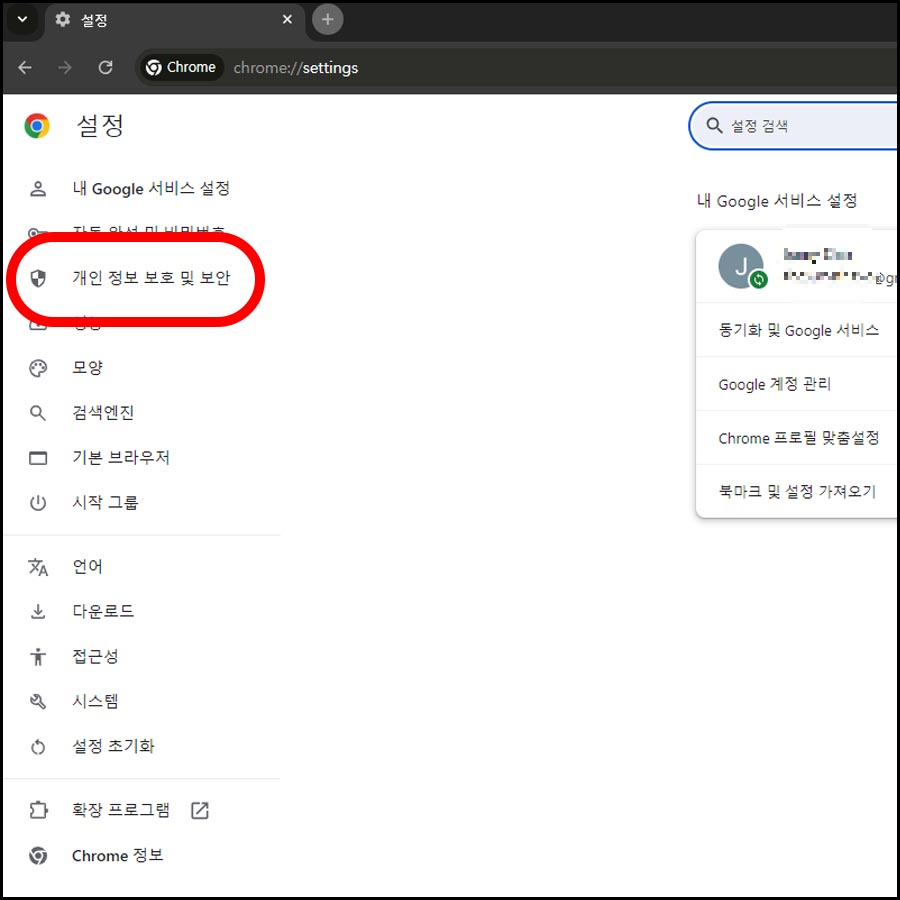 여기서 왼쪽 3번째 줄의 "개인 정보 보호 및 보안" 을 눌러주세요.
