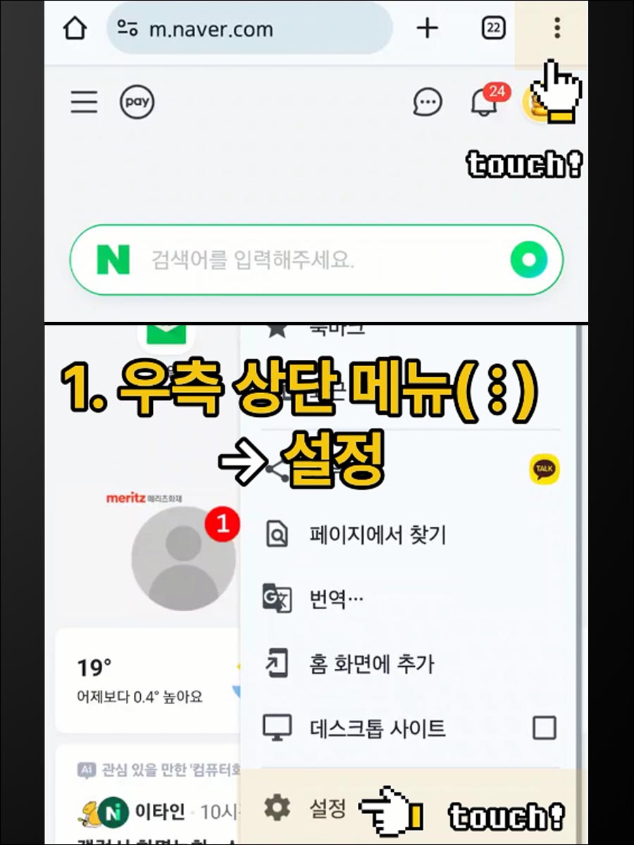 이때 상단바 오른쪽 끝을 보시면, PC 크롬과 동일하게 메뉴 버튼이"..." 점 3개로 구성되어 있습니다.