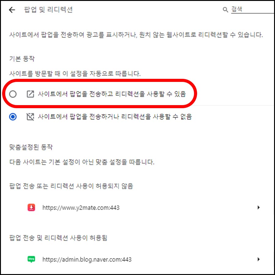 현재는 사이트에서 팝업을 전송하거나 리디렉션을 사용할 수 '없음' 으로 되어있습니다.