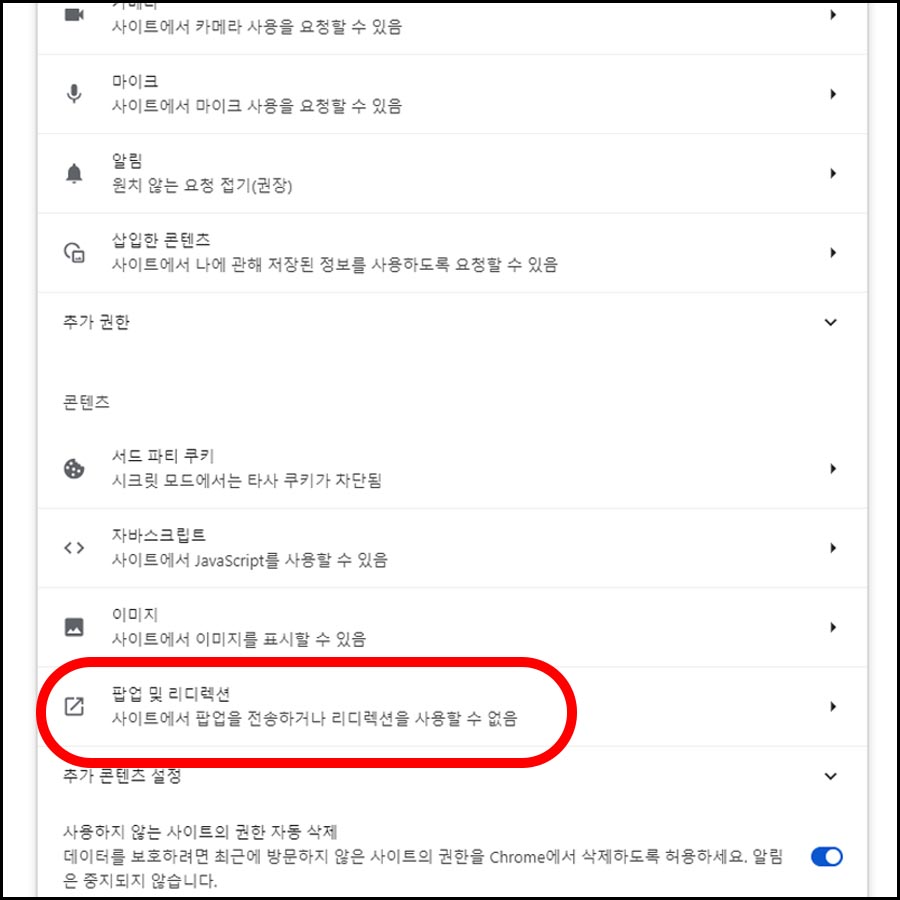 팝업 및 리디렉션 옵션을 누르면 오른쪽 끝에 회색 버튼(토글 스위치)이 보일텐데요. 이것은 비활성화 상태를 나타냅니다.
