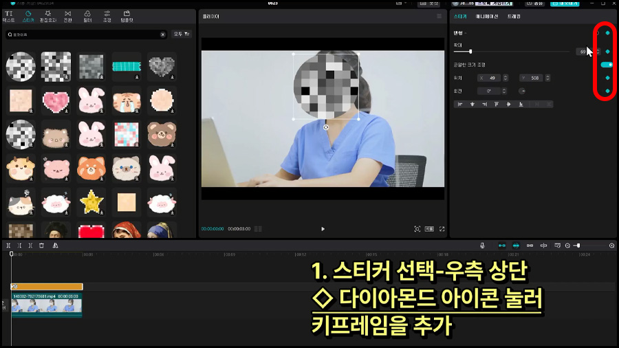 ④ 인물이 가만히 있지 않고 움직인다면, 키프레임 처리를 통해 스티커가 따라다니도록 해줘야 합니다.