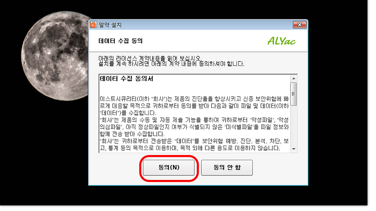 라이선스 계약이 나오면 '동의' 버튼을 눌러주세요.