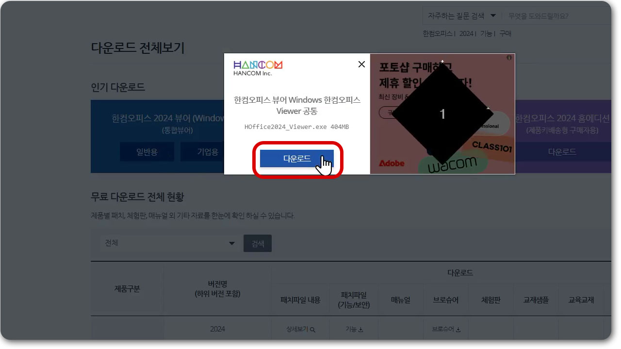 1. 한글 뷰어 다운로드 🔍버튼을 눌러 한컴 공식 사이트로 접속합니다.