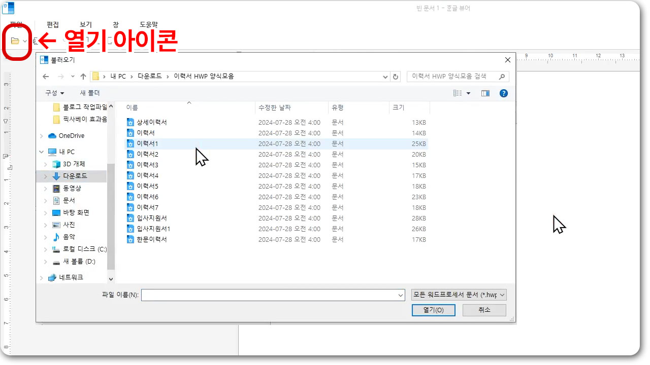 이 열기 버튼을 누르면 탐색기 창이 뜨며, 내가 원하는 hwp 파일을 클릭하여 열기를 하면 되겠습니다.