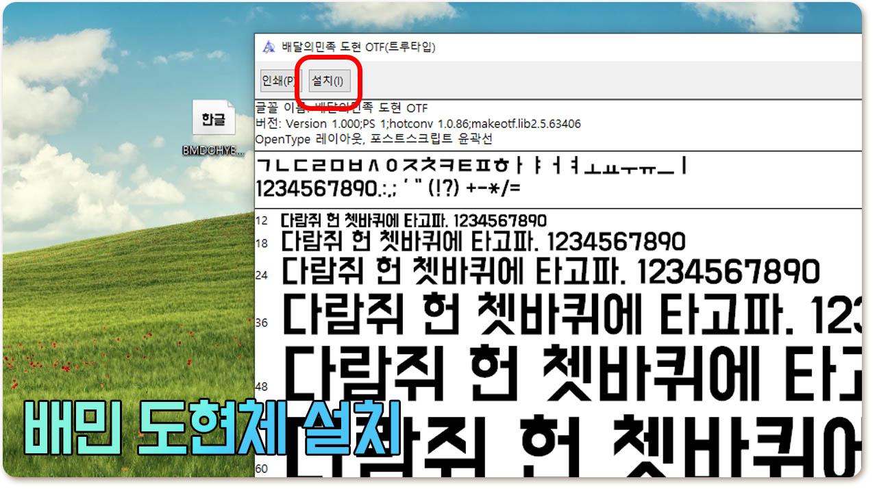 3. 새로운 창이 뜨면서 설치 라는 버튼이 보이실텐요. 이 버튼을 누르면 바로 배민 도현체를 사용할 수 있습니다.