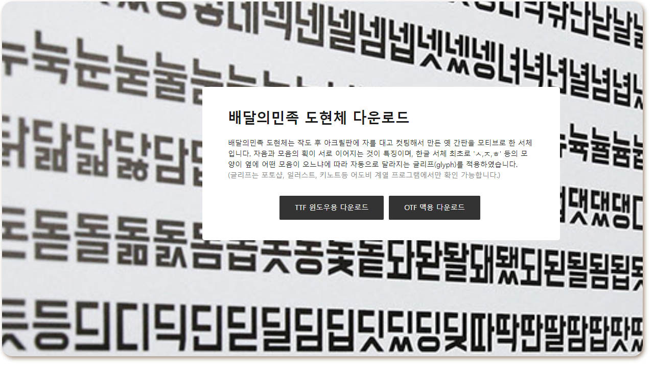 1. 본문 상단에 첨부해놓은 배달의민족 도현체 다운 버튼을 클릭하여 배민체 사이트로 접속하였다면 다음과 같은 화면이 보이실 텐데요. 필요한 폰트 파일 형식을 눌러서 내려받아 주세요.