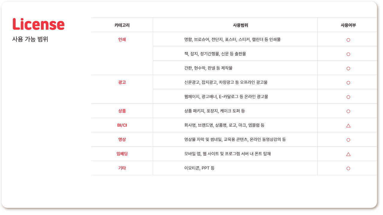 | 임베딩 | 웹사이트 및 프로그램 서버 내 폰트 탑재 | △ |