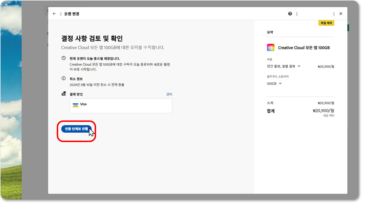 6. 우측 끝의 금액을 보시면, 월 20900원으로 어도비 할인 비용이 적용된 게 보이실 거예요. (이 가격은 1년 동안 적용되는 금액입니다.) 인증 단계로 진행을 눌러서 넘어가 주시고요😍